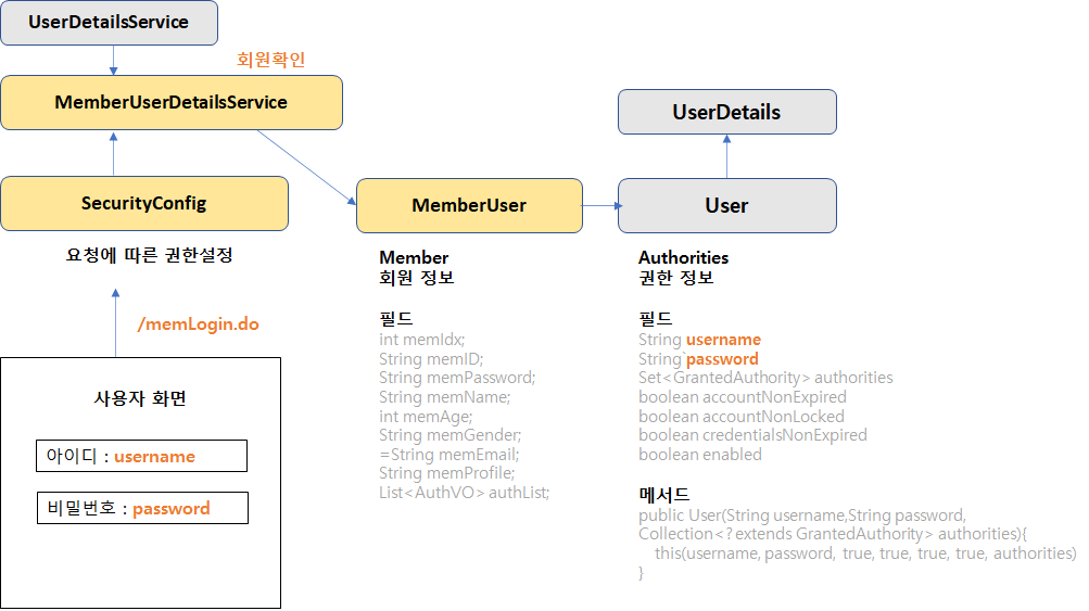 2. 생성자 메서드에서 권한정보( 슈퍼클래스 : User ) 에 사용자의 정보를 넘겨준다.