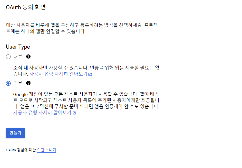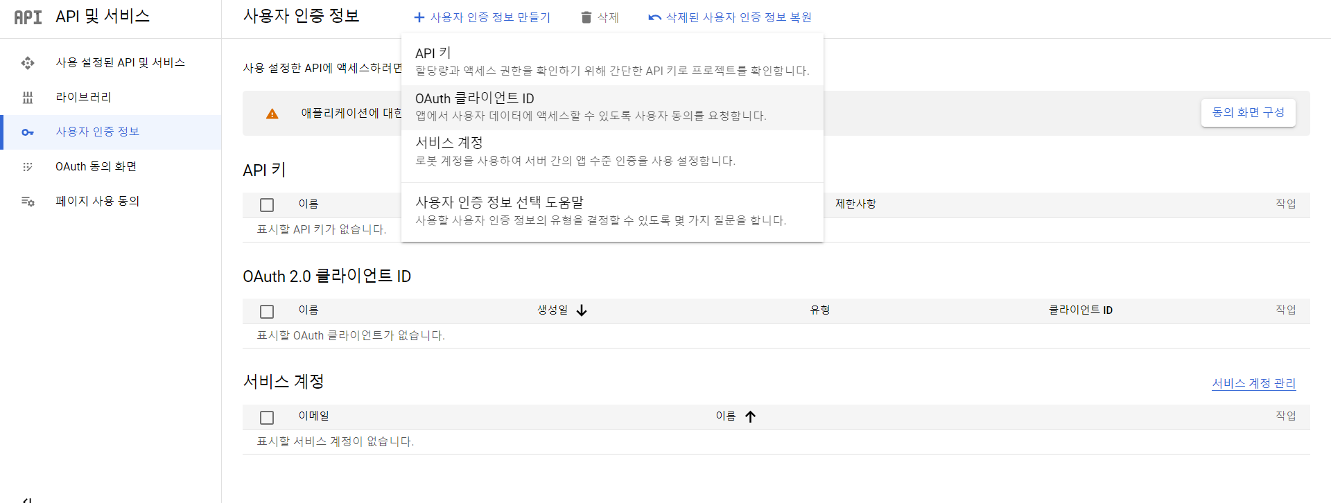 - 'OAuth 클라이언트 ID' 를 선택 시 먼저 OAuth 동의를 해주어야한다.