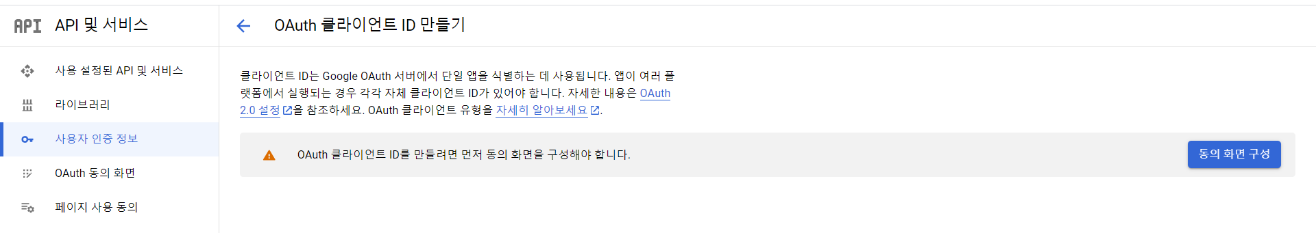 - 동의 후 다시 'OAuth 클라이언트 ID' 선택