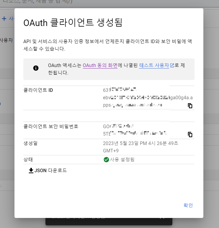 중요 한 위의 두가지를 입력하면 구글 API 서비스에서의 설정은 끝난다.