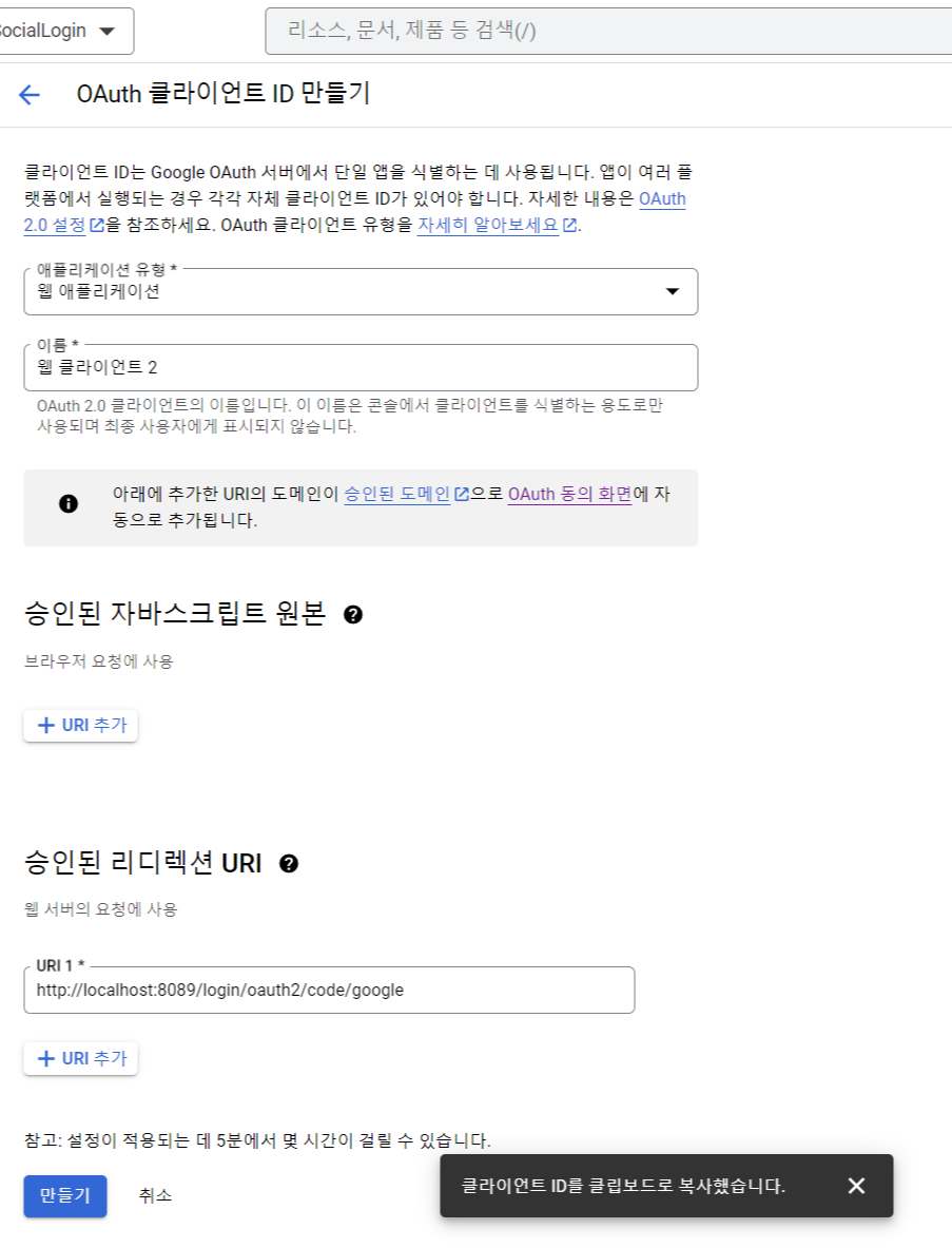 - 승인된 리다이랙션 URL : http://localhost:8089/login/oauth2/code/google