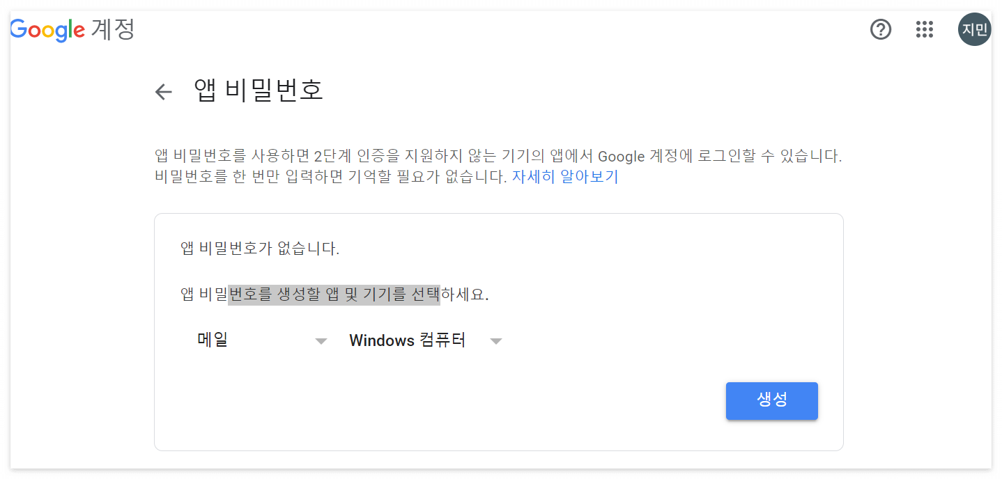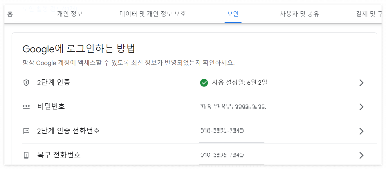 - 구글 계정 > 보안 > 2단계 인증 '사용'으로 변경