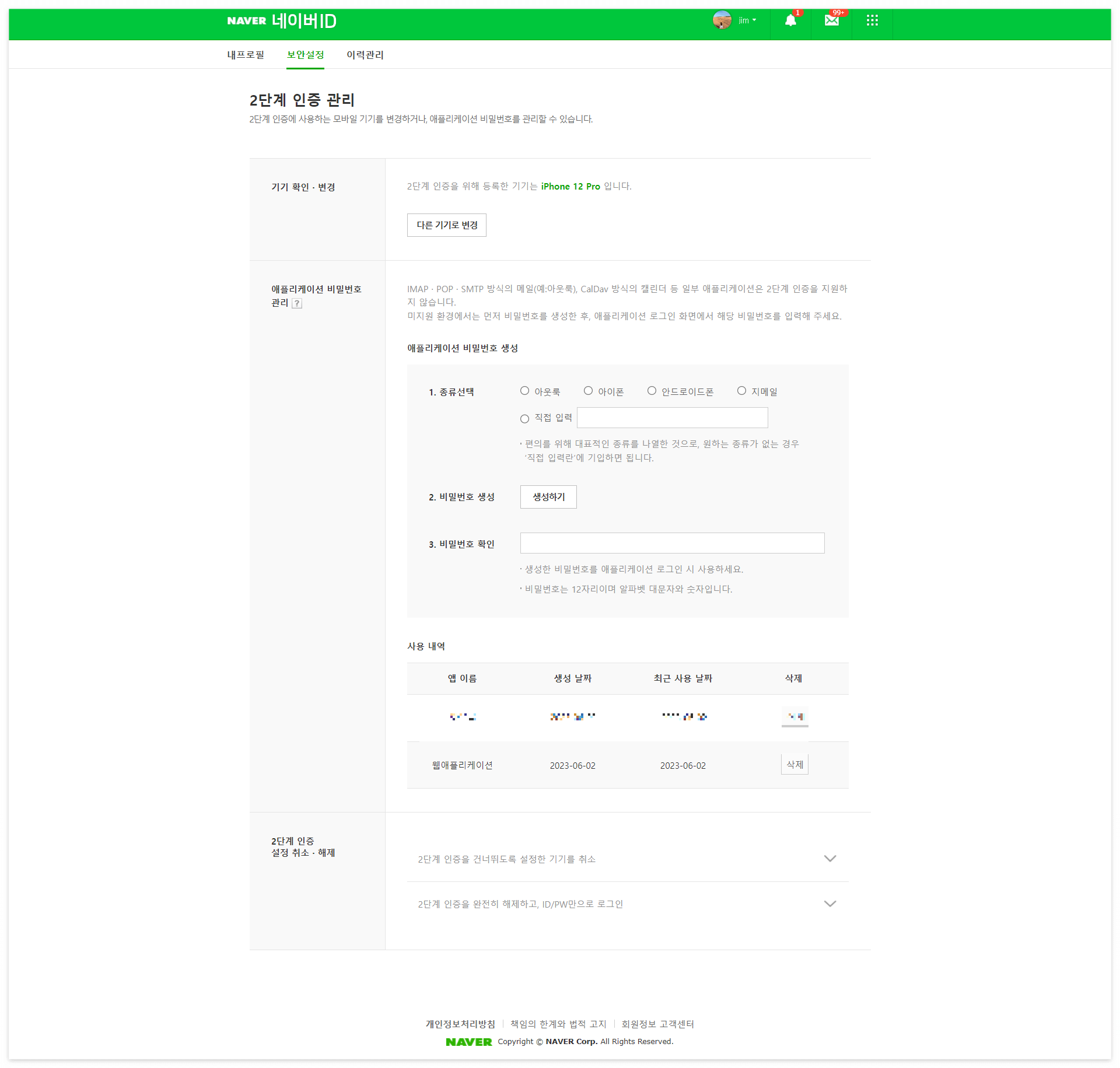 - 네이버 계정 > 보안 > 2단계 인증 '사용'으로 변경