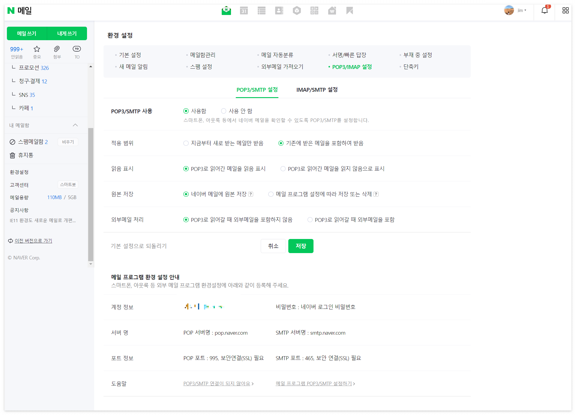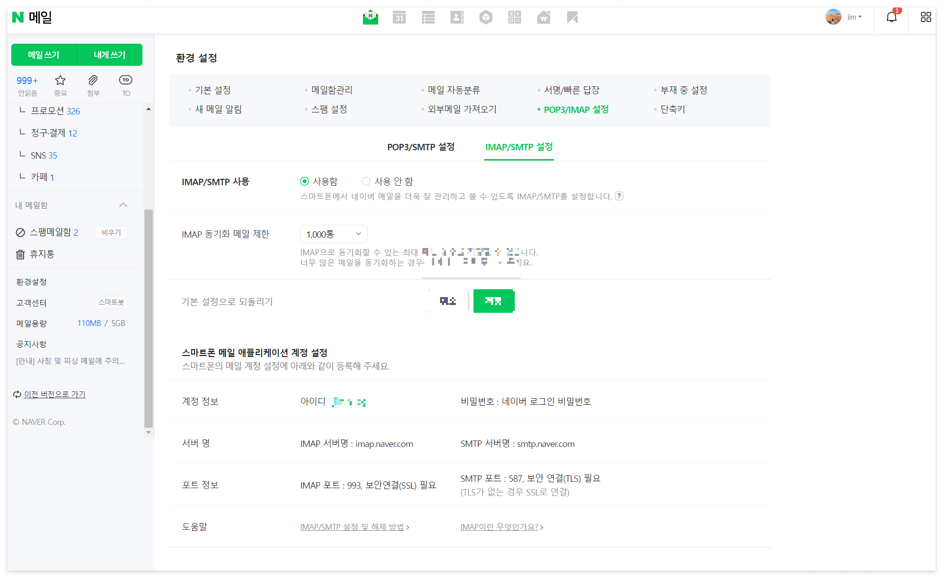 - POP3/SMTP설정, IMAP/SMTP 설정을 사용으로 변경한다.