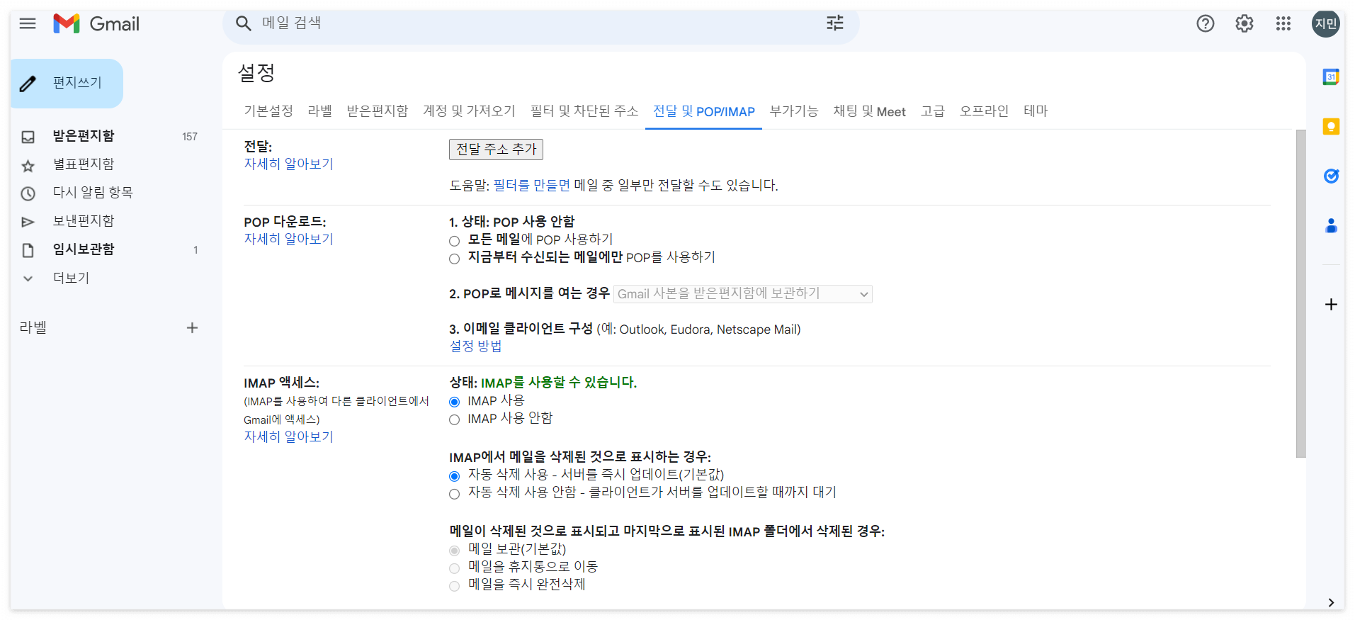 - 전달 및 POP/IMAP에서 'IMAP를 사용'으로 변경해준다.