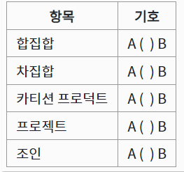 2. 다음 관계 대수 항목에 대해 괄호안에 들어갈 기호를 쓰시오.