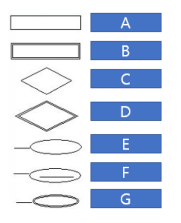 답 : A . 개체 타입 / B . 약한 개체 타입 / C .관계 타입 / D . 약한 관계 타입 / E . 속성 / F . 키 속성 / G . 다중값 속성