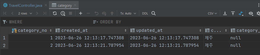 전달 받은 파라미터 형식의 데이터를 @RequestParam 어노테이션을 사용하여 파라미터의 값을 받아 카테고리 객체를 구하고 모델로 화면에 값을 넘겨주었습니다.