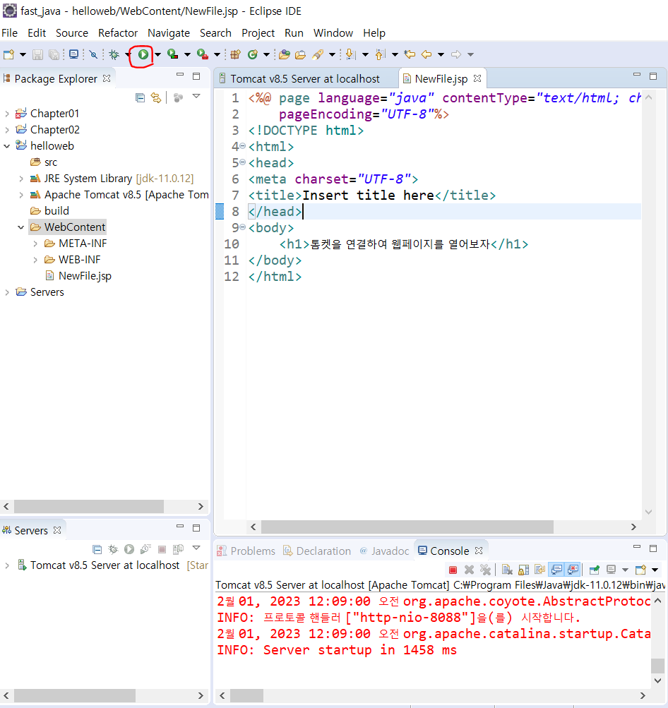 6 - 2 ) 생성한 문서에 내용을 작성하고 > Run 버튼을 클릭하여 웹페이지가 잘 나오는지 확인 가능하다.