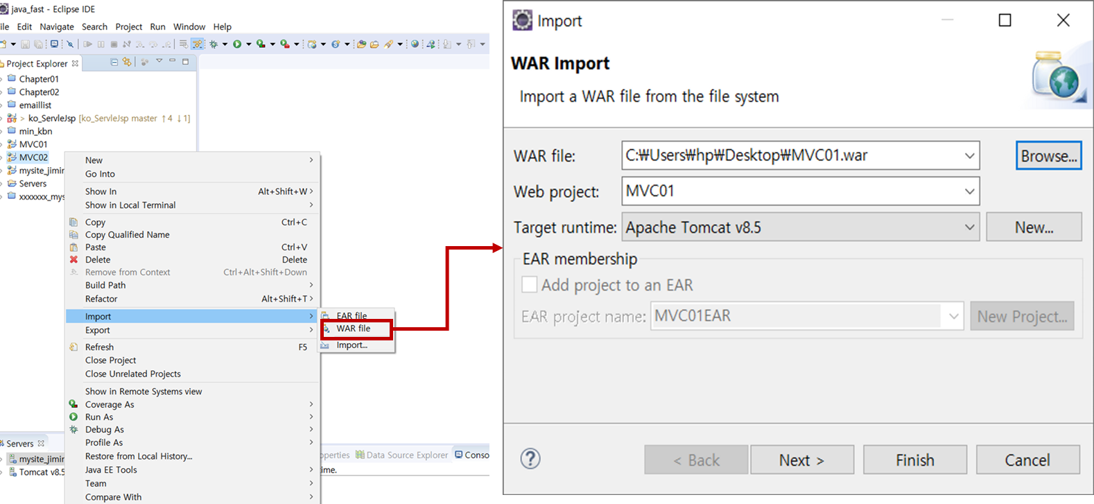 4) New Server 모달 리스트에서 'Apache > Tomcat v8.5 Server 선택' > Next 버튼 선택 > Browse.. 버튼 > 톰켓 파일 위치 찾아서 연결
