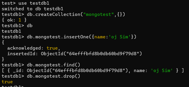 db.mongotest.findOne({}); - 지민이라는 이름의 문서 반환