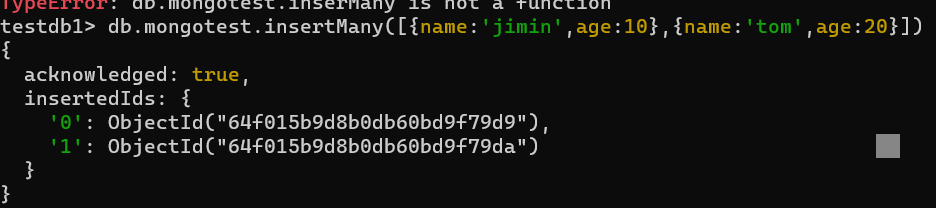 db.mongotest.insertMany([{name:'jimin',age:10},{name:'tom',age:20}])