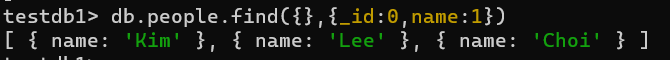 db.컬렉션이름.findOne({name:'jimin'},{_id:0,name:1,age:0})