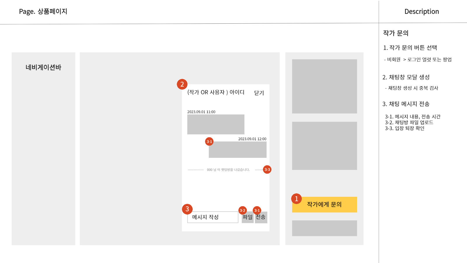 1) 상품페이지에서 일대일 문의 버튼을 통해 작가와 대화 할 수 있다.