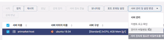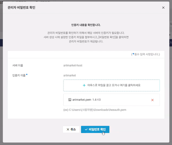서버에 접속하기 위한 비밀번호 확인 : 서버 생성시 받았던 인증키를 넣어 비밀번호를 확인할 수 있다.