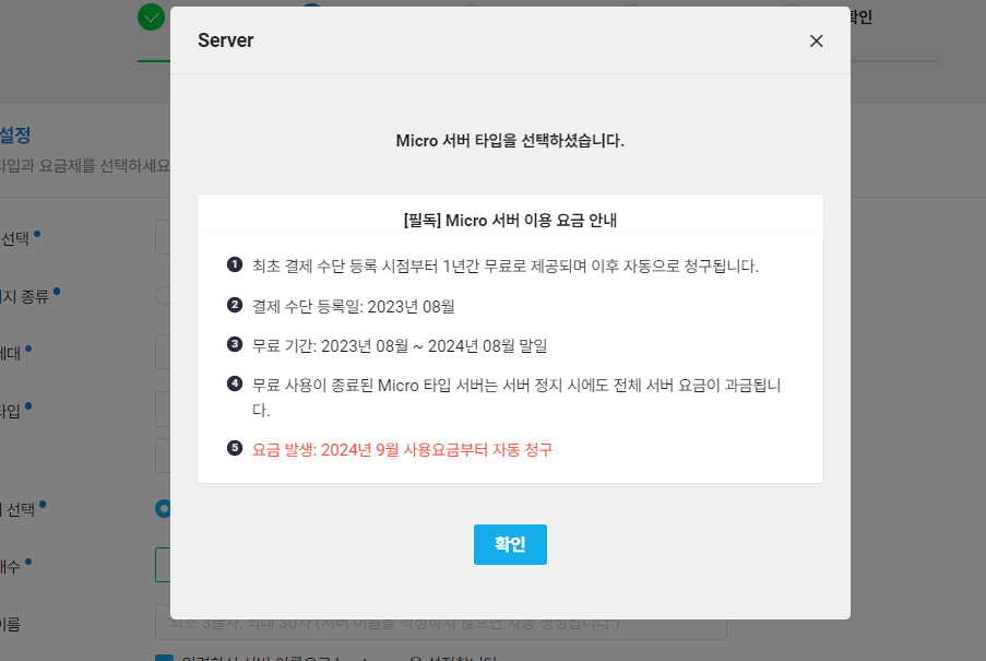 그리고 서버 설정시 설정타입을 standard로 했었는데, 무료로 일년동안 사용하려면, micro 를 선택해야한다.