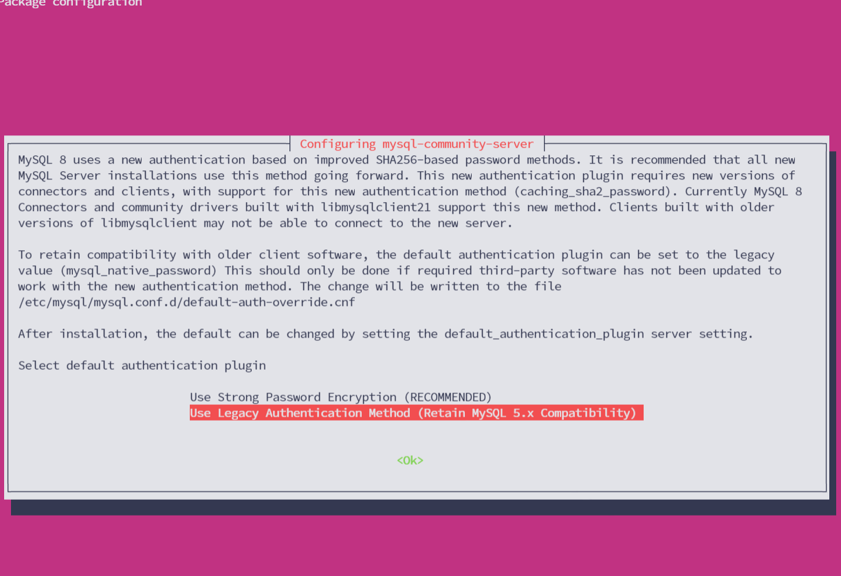 5) sudo apt install mysql-server => 설치 동의 y , 비밀번호 설정 , 기존 인증 방법 사용(MySQL 5.x 호환성 유지)