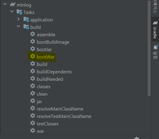 처음 프로젝트 생성시 jar로 작업했으면 bootWar 가 없을 수 도 있는데 그렇다면 build.gradle에서 추가작업을 해주면된다.