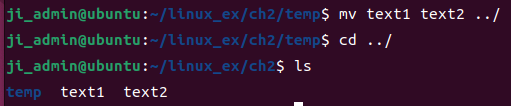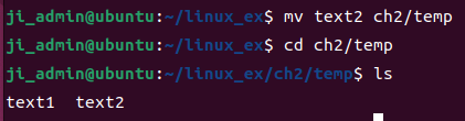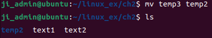 1) 파일명 변경![]() 2) 파일 이동 mv (파일명) (이동경로) ![]() 3) 파일 여러개를 디랙터리로 이동 ![]() 4) 디렉터리 이동 temp3를 temp2 안으로 이동 ![]() |