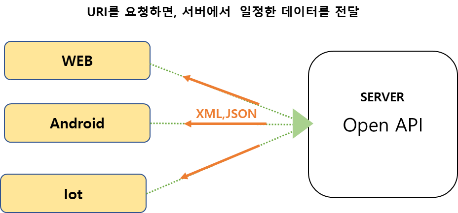 다양한 접속환경( 다양한 접속환경 : 안드로이드,웹브라우저, Iot )에서 사용할 수 있는 데이터 타입( xml 또는 JSON )으로 전달하기위해서 사용이된다. xml 또는 JSON 타입으로 데이터를 전달하면 해당 접속 환경이 화면을 가공하여 사용자에게 전달한다.