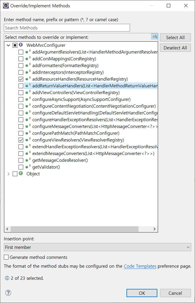 4) WebMvcConfigurer를 받아서 메소드를 오버라이딩하여 사용한다.